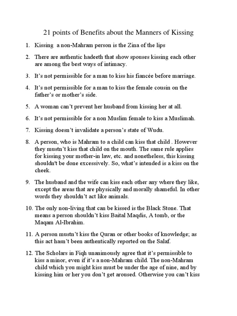 Quote let those who find not the wherewithal for marriage keep themselves chaste until god gives them the means. Every human would want a good partner, be responsible, and have good religious knowledge. No, no kissing or any kind of touching allowed in islam for unmarried people, even if they will get married, because that person is haram to you. The dignity of human beings and especially the dignity of women is something that is utterly valued and highly sanctified in islam. Allah will degrade his situation to worse. Between married couples, a parent to a child or vice versa, a grandparent to a grandchild etc are halal. Perhaps he's not the best muslim in the world.you can nudge him to make him better. You can get to know someone within limits i.e. Encourage him to make salaah at the masjid. Something cannot be declared prohibited if there is no clear proof in the quran and in the books of sunnah. Even a peck on the cheek would be considered inappropriate. Ask question asked 3 years, 4 months ago. It is actually arabic custom to kiss either side of the cheek when greeting loved and dear ones.